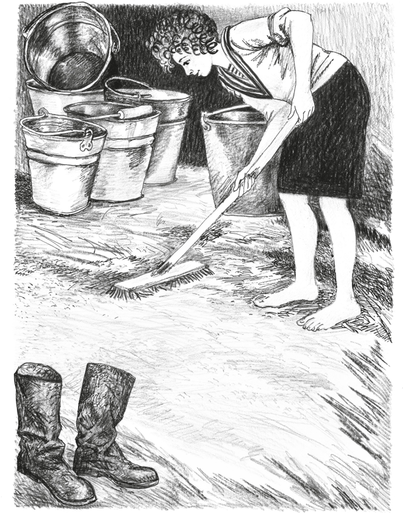 Я стягиваю сапоги их надо беречь. В одной руке у меня ведро с горячей водой, в другой половые тряпки.