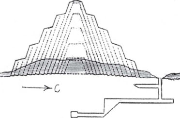 Траншею вырубали открытым способом при дневном свете. Затем, облицевав её блоками, выстраивали внутренние камеры и коридоры, а затем начинали возводить ступени пирамиды (рис. 52).