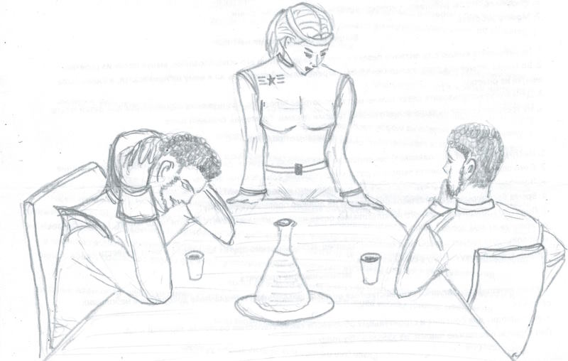 В кают-компании «Экскалибура» было светло и прибрано. У входа в сам отсек стояла охрана, представлявшая собой весьма «пестрое» сборище. Один в черном был из преторианской гвардии. Эмблема на груди в виде ракеты с надписью «Шафрат» говорила о том, что этот из экипажа одноименного крейсера Альянса. У противоположной стены от входа стоял лысый мужчина с недельной щетиной на уставшем лице и очень добрыми голубыми глазами. Темно-синий костюм с красными нашивками выдавал в нем командира боевого подразделения местных сил обороны Парпланда. Он искоса посматривал на представителя Альянса, который не удосужился даже снять шлем, оставаясь полностью закрытым для какого-либо стороннего контакта. Последним персонажем этого сообщества был короткостриженый парень крупного телосложения в серебристом костюме Звездного Патруля. Все трое молчали, зато было жарко за дверью в самой кают-компании. Дрон класса «Хронолог» вел запись того, что тут происходило прямо на ГЛТ-спутник.