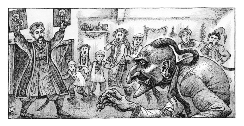 Гостям поднесли варенуху с изюмом и сливами и на немалом блюде коровай. Музыканты принялись за исподку его, спеченную вместе с деньгами, и, на время притихнув, положили возле себя цимбалы, скрыпки и бубны. Между тем молодицы и дивчата, утершись шитыми платками, выступали снова из рядов своих; а парубки, схватившись в боки, гордо озираясь на стороны, готовы были понестись им навстречу как старый есаул вынес две иконы благословить молодых. Те иконы достались ему от честного схимника, старца Варфоломея. Не богата на них утварь, не горит ни серебро, ни золото, но никакая нечистая сила не посмеет прикоснуться к тому, у кого они в доме. Приподняв иконы вверх, есаул готовился сказать короткую молитву как вдруг закричали, перепугавшись, игравшие на земле дети; а вслед за ними попятился народ, и все показывали со страхом пальцами на стоявшего посреди их козака. Кто он таков никто не знал. Но уже он протанцевал на славу козачка и уже успел насмешить обступившую его толпу. Когда же есаул поднял иконы, вдруг все лицо его переменилось: нос вырос и наклонился на сторону, вместо карих запрыгали зеленые очи, губы засинели, подбородок задрожал и заострился, как копье, изо рта выбежал клык, из-за головы поднялся горб, и стал козак старик.