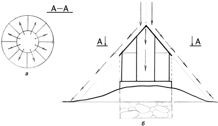 Рис. 1. Схема распределения энергетических потоков, обеспечивающих энергетическую защиту дома: а горизонтальный разрез; б вертикальный разрез