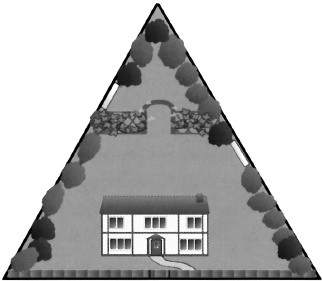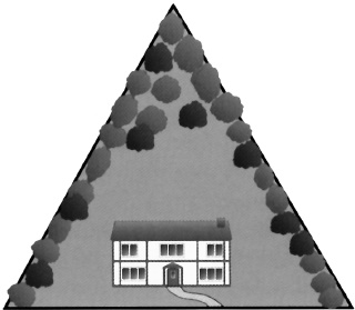 Итак, на рисунке 1 в сделано многое для того, чтобы компенсировать воздействие острых очертаний границ участка. Дом расположен ближе к фронтальной линии, к входной двери ведет изогнутая (!) дорожка. Живая изгородь, посаженная с двух сторон, позволяет защитить дом сзади и с боков от потоков негативной ци, которая может исходить извне.