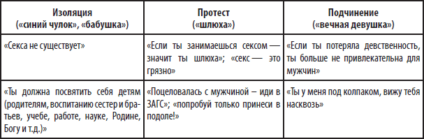 Одно из самых распространенных детских воспоминаний наших клиенток состоит в том, что в возрасте 1314 лет, когда клиентка стала девушкой, мать запретила ей встречаться с мальчиками. Поскольку в реальной жизни суть отношений была скрыта, а именно слиты в одну две роли матери (мать и соперница), то скрыты были и манипуляции, запрещающие девушке жить как женщине. Чаще всего клиентки вспоминают, что мать демонстрировала заботу, говоря: «Не пойдешь гулять, пока не сделаешь все уроки». Скрытые же послания гласили: «Боюсь, что ты встретишься с мальчиками и вступишь в сексуальные отношения», «Боюсь потерять власть над тобой, если ты станешь сильной». «Ты моложе и красивее меня, если ты вступишь в возраст сексуальности, мне придется уступить тебе свою власть». Но поскольку тема секса в семье табуировалась, то девушка запрещала себе понимание истинных мотивов своей матери.