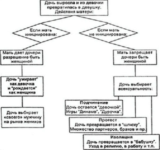 Однако, как подчеркивают Ефимкина и Горлова, если же мать инициированная женщина, то она не скрывает от дочери тему секса, и тем самым дает ей разрешение на то, чтобы та стала женщиной. Мать не только помогает дочери пройти соответствующую инициацию, но и сама является образцом для подражания.