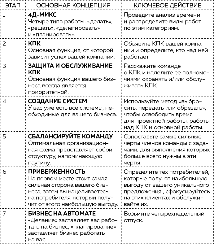 Вот и все. Семь шагов. В таком порядке. Эти семь шагов вы будете открывать и претворять в жизнь на протяжении всей книги. В процессе возникнут чувства разочарования, застоя, желание сдаться. Не пугайтесь, это просто признаки того, что вы начинаете привыкать к новым неудобным вещам, которым я вас учу. Опять же, не бойтесь и не смейте останавливаться. И в результате вы получите бизнес, который работает автоматически, как часовой механизм.