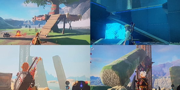 Например, чтобы забраться куда-либо, игроку часто нужно манипулировать объектами для создания формы трамплина перебить верёвку и опрокинуть трап (рис. 1), завалить на бок каменные колонны (рис. 2 и 4), поднять ледяным домкратом пластину (рис. 3).