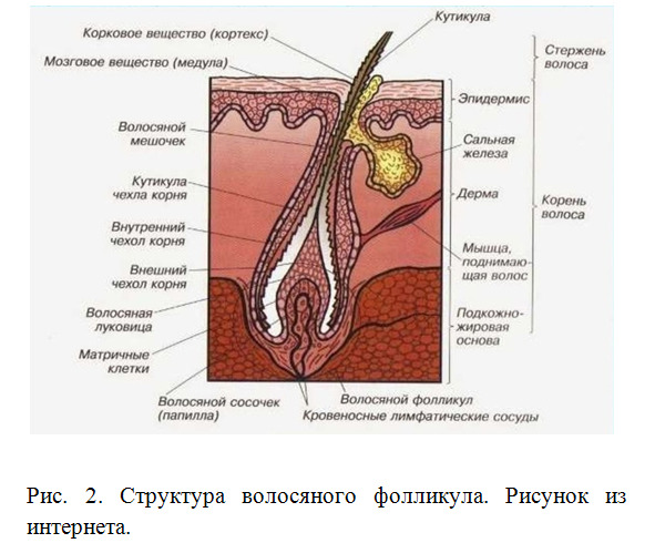 Волос по своему строению делится на ствол видимая над поверхностью кожи часть волоса (Рис. 1) и корень часть волоса, расположенная в дерме, в корневом влагалище (Рис. 2). Корень и корневое влагалище вместе образуют волосяной фолликул (Рис. 2, 3).