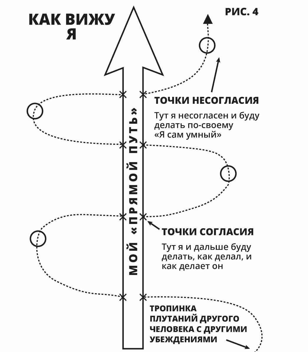 И можно представить, что есть моя дорога прямая, красивая. А есть какая-то тропинка суждений другого человека, иногда пересекающая мою дорогу. Она петляет то вправо, то влево и периодически пересекает мой путь. В точках пересечений наших дорог там, где мы имеем одинаковые суждения и установки люди нам особенно приятны. И мы, в моменты пересечений наших мировоззрений и ценностей хотим дружить с этим человеком и улыбаться ему, но когда его «вильнуло в сторону» и сильно увело от правды (от нашей правды), то мы теряем его из виду, не соглашаемся с ним, и он кажется нам попросту дураком.