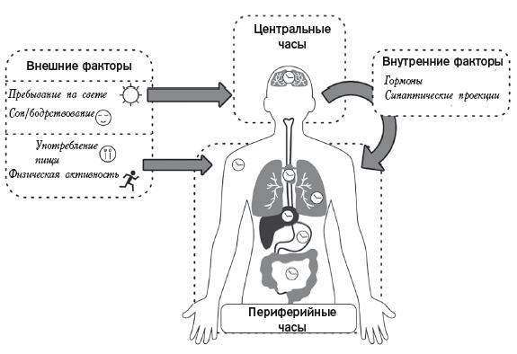 Мозговые часы. Это главные часы, расположенные в супрахиазматическом ядре гипоталамуса. Они получают внешние сигналы от окружающей среды и координируют реакцию организма с помощью гормонов и нейромедиаторов.