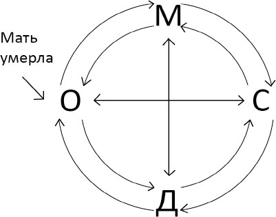 Я бы попросила прийти на первую сессию всех: отца, мать, пятнадцатилетнего сына (идентифицированного пациента) и тринадцатилетнюю дочь. Я всегда стараюсь детально изучить семейную историю. Начинаю я с нуклеарной семьи, то есть с присутствующих. В нашем случае это мать, отец и двое детей. Изучая историю семьи (по меньшей мере три поколения), я выясняю, что отец недавно потерял не только работу: у него умерла мать, погибла в ДТП. Дочь сообщает, что их мама с тех пор начала больше и больше пить и часто на всех бросается. Дочь рассказывает, что последнее время все больше сидит дома, у себя в комнате, а не развлекается с друзьями. Сын замкнутый, но злость на родителей выражает охотно.
