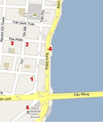 На прилагаемой карте место высадки обозначено цифрой «1», отель цифрой «2». Ну и, чтобы вам было интереснее жить, цифрой «3» я, заботливый автор, обозначил ближайшую к отелю вполне приличную забегаловку общественного питания (вспоминаем во Вьетнаме с кафешками нечеловеческая проблема), цифрой «4» набережную с мраморными скульптурами, а цифрой «5» музей тямской скульптуры.