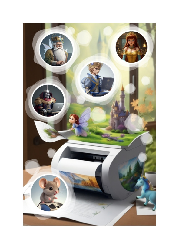 The old printer spoke and spoke. Beside him, in the paper tray, the little computer mouse slept. In her round head, amazing and fantastical images swirled, born from dreams and imagination: a brave prince, a beautiful princess, a wise king, and a wicked advisor And the old Albert beamed brightly with all his LEDs, feeling that he had finally found a kindred soul and that real adventures and great deeds awaited them both. The curious little mouse instilled in him a belief in himself and in a beautiful future.