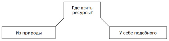 У человека, компании или государства есть только два способа получить какой-либо ресурс взять у себе подобного или взять из природы. Сам по себе человек, как это ни прискорбно, ничего не создаёт, а только наоборот, интенсивно расходует все виды ресурсов ради возможности направить их небольшую часть по своему усмотрению.