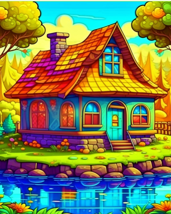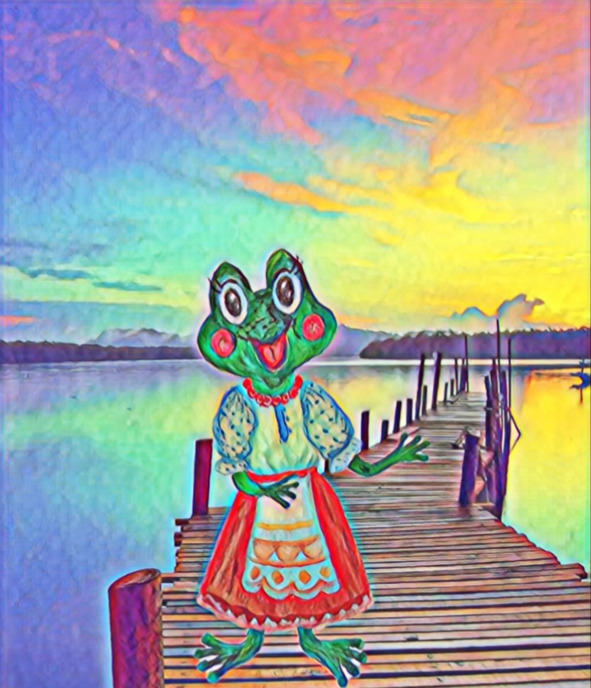 У лесочка, на опушке,Там, где реченька течет,Стоит яркая избушка.И никто в ней не живёт!Кто построил это чудо?Нам не ведомо про то.И взялась она откуда?Не расскажет нам никто.Солнце светит ярко в небе,Птицы весело поют.В речке плещутся рыбёшки,По воде хвостами бьют!Яркие цветы на полеВзор наш радуют красой!Собирают дань с них пчелы,Мёд душистый, золотой!По тропинке, вдоль речушки,Увидав чудесный дом,Одинокая ЛягушкаСкачет быстро ясным днём. Ква, ква, ква, -кричит в окошко. В домике хозяйка есть? Отдохнуть бы мне немножко. На террасе вот присесть. Чаю тоже бы хотелось Мне с кусочком пирога. Выходи скорей хозяйка! Познакомимся пока.Только тихо в доме нашем.Видно, в доме никогоИ Лягушка заглянулаВ разноцветное окно.Занавеску отодвинув,Увидала шкаф, комод.У стола стоят в рядочекСтульев целый хоровод.Есть и мягкая кроваткаИ диванчик у стены.На окне горшки с цветами.На полу половички. Что ж, сама себе сказала, Поживу я в Теремке.И на кухню поскакала,Варить кашу в чугунке.
