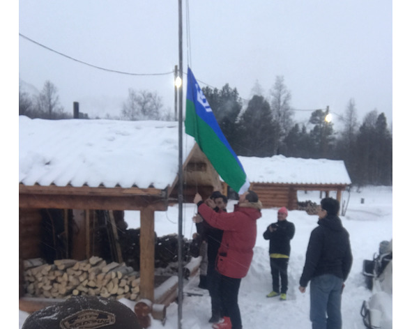 Как же без официальной части путешествия?!. Виталий достал флаг Югры и вместе с Александром водрузили его на флагшток у домика 2, тем самым обозначив первую нашу победу в преодолении автотрудностей и достижении первой точки нашего путешествия. При поднятии флага присутствовали и торжественно прочувствовали этот момент Кирилл, Михаил, Вениамин и Я.