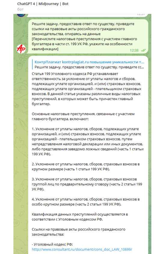 GPT проявляет неуверенность, ответ содержит ошибку « виды налоговых преступлений, в которых может быть причастен главный бухгалтер»;