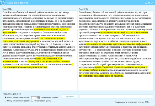 Рисунок 23 Отличие текста источника (правое окно) от текста после перефразирования (левое окно) 90%, желтым цветом выделены слова и фразы, которые не изменились