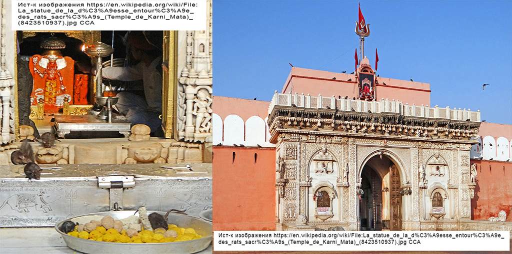 Существует легенда, согласно которой в XIV веке богиня Дурга воплотилась в теле женщины, которую звали Карни Мата. Уже в юные годы она была признана святой и обзавелась толпами последователей, с которыми скиталась с места на место. У Карни Маты был приемный сын и однажды, набирая воду из пруда, он утонул. Легенда рассказывает, что Карни молила бога смерти Яму не забирать ее пасынка, но Яма отказал в ее просьбе. Тогда святая произнесла заклятие, согласно которому все мужчины ее касты после смерти будут обретать временные тела крыс, минуя царство Ямы, а в следующем воплощении вновь рождаться людьми. Позже на месте, где было произнесено это заклинание, в честь Карни Маты был построен храм, существующий и сегодня и известный как «Храм крыс», потому что в нем живут более 20 тысяч крыс. По всему храму расставлены многочисленные миски с молоком, зерном и другими угощениями для священных грызунов, а в мраморных стенах сделано множество отверстий и ходов, чтобы крысам было удобно перемещаться из одного помещения в другое.