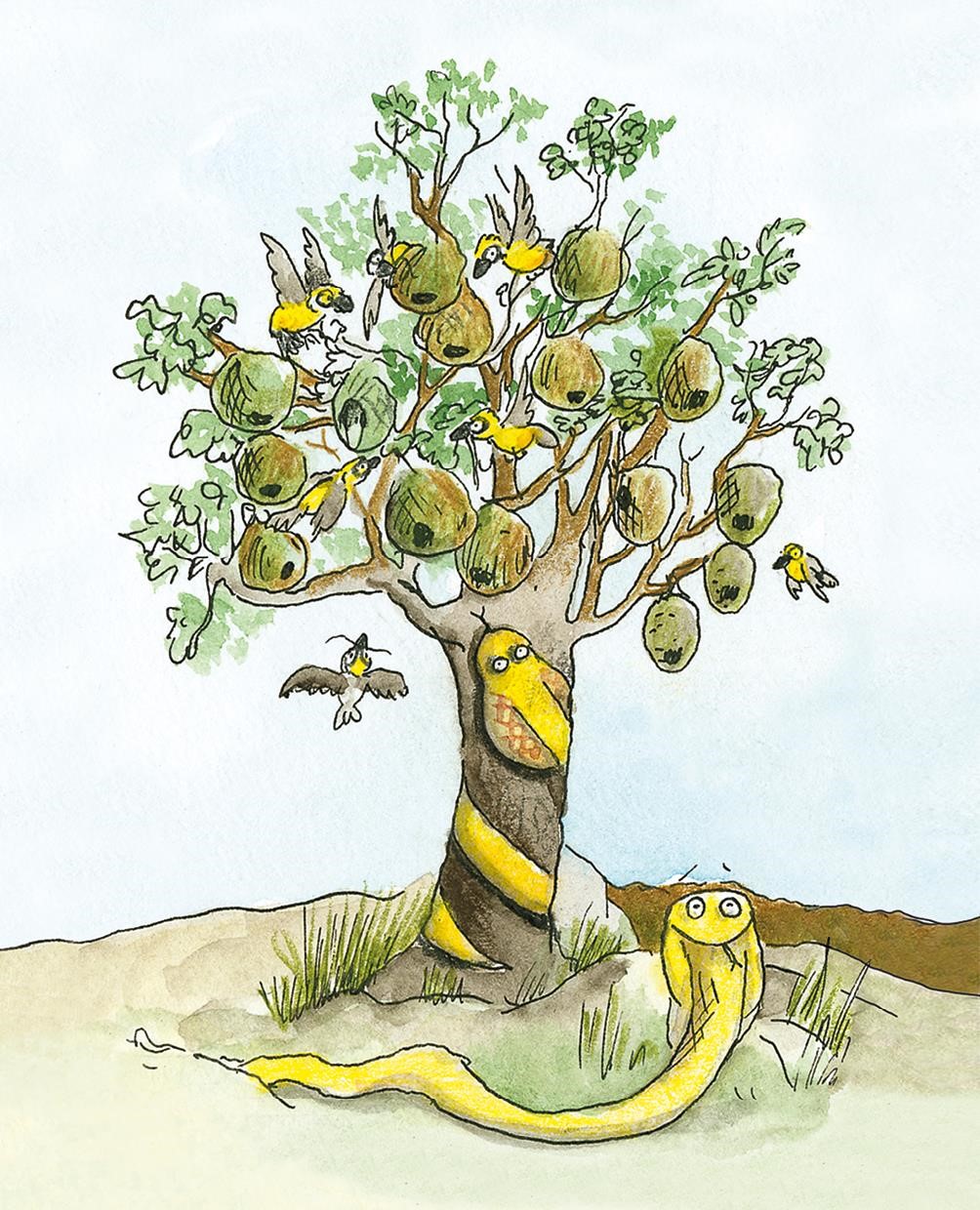 Деда кивнул. На дереве, где эти птицы гнездились, Кисточка нарисовала длинную толстую змею. Она обвивалась вокруг ствола, как будто собиралась ползти наверх. Рисунок получился таким реалистичным, что никакая другая змея не станет сюда лезть, чтобы разорять птичьи гнёзда.