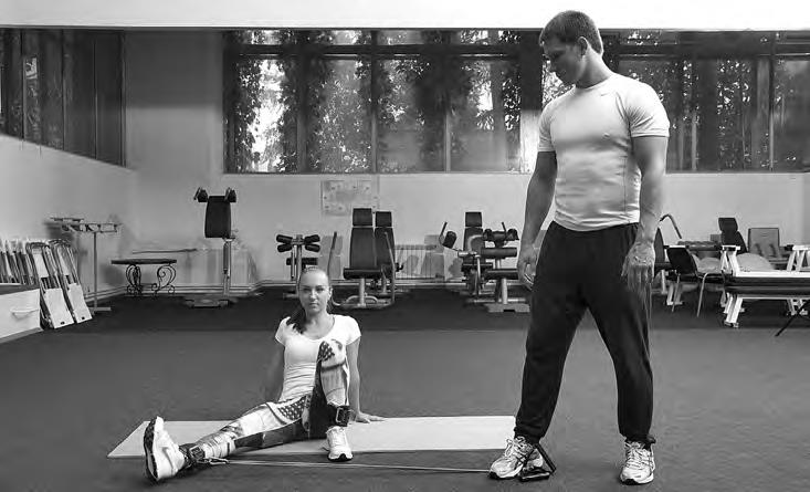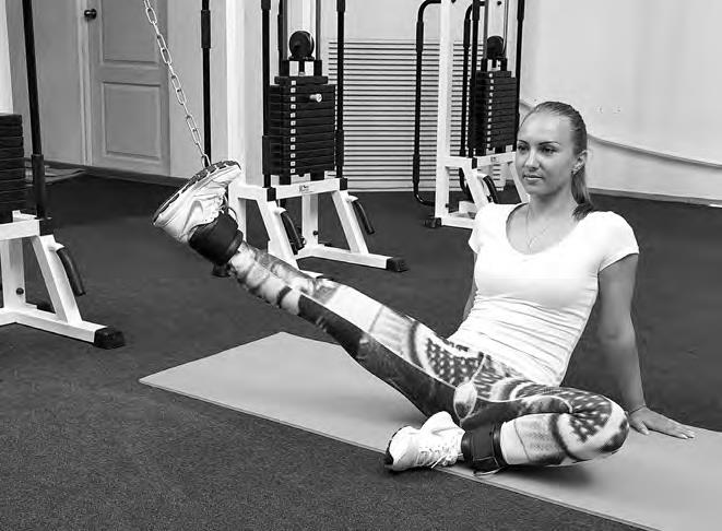 И.П. Сидя на полу, боком к неподвижной опоре (или партнеру), ноги вытянуть вперед. Тяга прямой ногой резинового амортизатора из стороны к центру.