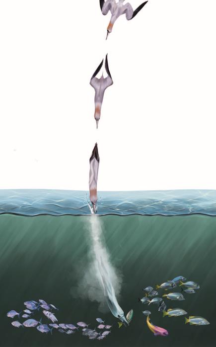 К подобной тактике прибегают и многие птицы-рыболовы вроде крачек и северных олуш они пикируют в воду и ныряют. Северные олуши осматривают большие участки открытого океана в поисках признаков рыбьих косяков, возможно, темных пятен на поверхности или присутствия других птиц, которые успели первыми. Плотная стая северных олуш или их близких родственников, других олушевых, пикирует с огромной высоты и бомбардирует косяк рыб со скоростью 100 км/ч это одно из самых великолепных зрелищ, которые дарит нам природа. Их беспощадный блицкриг снова напоминает Вторую мировую войну пикирующие бомбардировщики юнксрсы или японские самолеты-камикадзе. С той поправкой, что олушевые вовсе не идут на смерть. Точнее, обычно они не погибают, но при неудачном нырке все-таки могут и сломать шею. К тому же, если нырять с огромной скоростью всю жизнь, в конце концов испортишь себе зрение, и жизнь многих олуш обрывается именно из-за слепоты[1]. Поэтому можно сказать, что ныряние сокращает им жизнь. Однако, если бы они не ныряли, они умерли бы от голода. Олушевые настолько узкие специалисты по нырянию, что, утратив это умение, не смогли бы конкурировать с другими птицами, в том числе с чайками, которые высматривают добычу с поверхности воды.