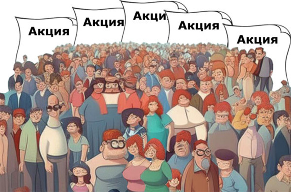 Вот я и говорю, сделаем акции, это такие бумажки, которые будут даваться каждому в обмен на его деньги. Вот, например, сколько нас, опять забыл.