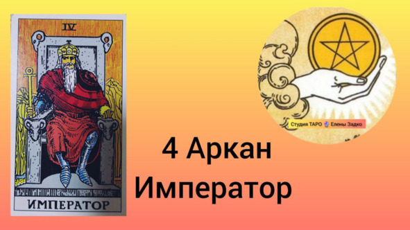 На оранжевом фоне в монументальном, сером троне сидит Император, в его руках видны символы его власти, на голове корона, его одежды красно оранжевого цвета, за спиной видны горы.