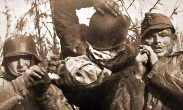 Солдаты панцергренадерской дивизии «Фельдхеррнхалле» несут сослуживца, раненного в бою