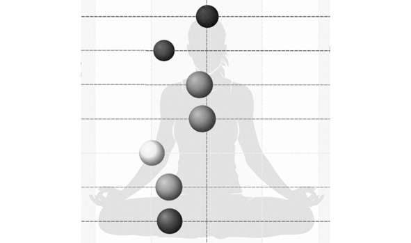 Картина Чакр (рис. 4) дает нам ключ к пониманию психологических причин тревожности. Как мы видим, четыре Чакры смещены вправо, что характеризует концентрацию на внутренних переживаниях. Это тонко чувствующий человек, погруженный во внутренние рефлексии.