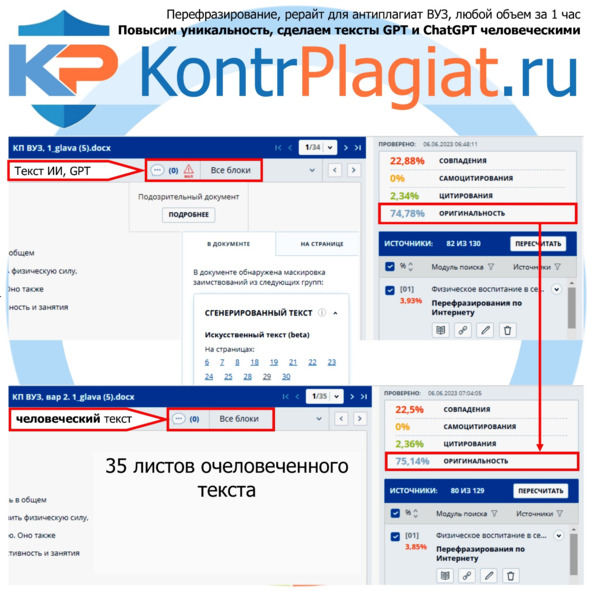 КонтрПлагиат, сервис, известный в академических кругах как академическая нейросеть перефразирования текстов, содержащих плагиат и очеловечивания текстов, сгенерированных ИИ, например GPT, рис. 4.