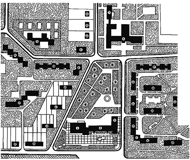 Рис. 1.5. Пос. Октябрьский совхоза «Селюты» Витебского р-на, схема генплана центральной части: 1 клуб на 400 мест; 2 торговый центр; 3 административное здание; 4 школа; 5 детсад-ясли на 140 мест; 6 фельдшерско-акушерский пункт; 7 школьный интернат; 8 спортзал; 9 24-квартирный жилой дом; 1316 16-квартирные жилые дома; 17 3-этажный 3-квартирный жилой дом; 18 12-квартирный жилой дом; 19 2-квартирный жилой дом; 20 6-квартирный жилой дом; 2123 2-квартирные жилые дома; 24, 25 2-, 4- и 5-этажные жилые дома; 26, 27 20-квартирные 2- и 3-этажные жилые дома; 28, 29 18-квартирные 3-этажные жилые дома