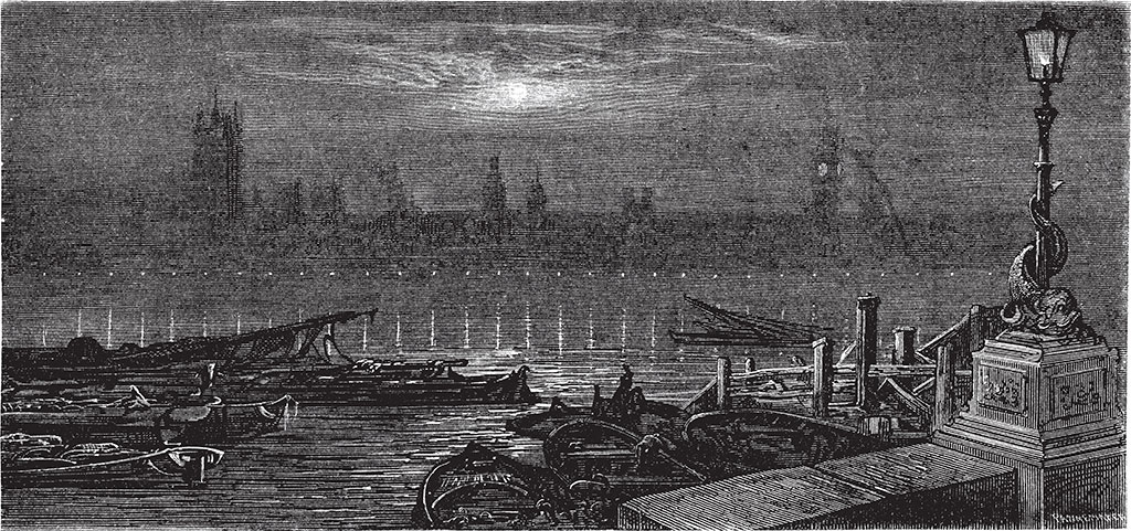 Зато мосты, переброшенные через Темзу, позволяют любоваться самыми прекрасными видами. Впереди кипучая деловая жизнь города, справа и слева великолепные памятники столицы Соединенного Королевства, которые возвышаются над крышами зданий, подобно скалам или островкам над волнами океана, а наверху, над нашими головами небесный простор, и порой, правда очень редко, луч солнца проскальзывает между облаками, а затем теряется и угасает в клубах дыма, которые неустанно и беспрерывно извергают тысячи заводских труб.
