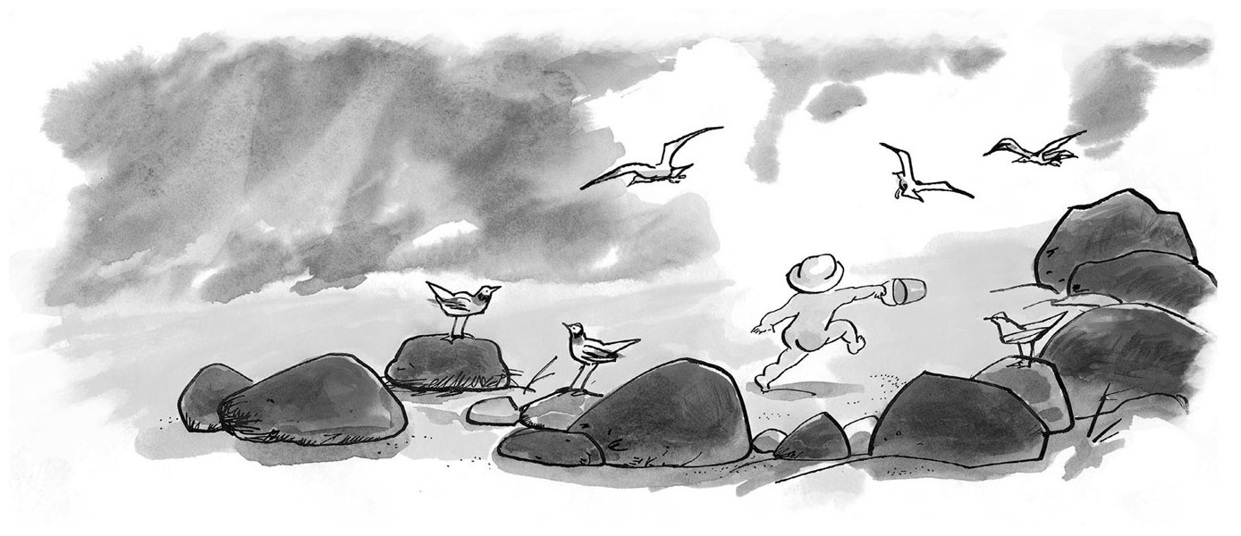 Но не успела мама развести костёр, как Малышка Мортен снова убежал к морю. Его ножки мелькали быстро-быстро, как барабанные палочки, но папе удалось вовремя схватить его.