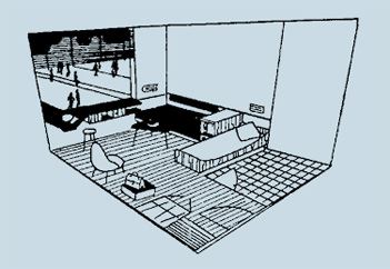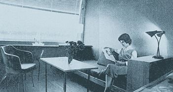 Стилобат с общими помещениями лишь немного выдвинут вперед с правой стороны, а позади прямоугольного корпуса образует выступ с внутренним двориком. Весьма необычен и набор общественных помещений: помимо ожидаемых в гостинице двадцатого века ресторана, общей гостиной, парикмахерской и почтового отделения со сберкассой, в стилобате находились также оборудованный киноустановкой зрительный зал на 500 человек, по замыслу архитектора легко трансформирующийся в танцевальный, библиотека, бильярдная и комната для игры в настольный теннис. Это значит, что гостиница скомбинирована с полноценным молодежным клубом, открытым не только для постояльцев: туда вел отдельный вход с улицы Малые Кочки (теперь Савельева).