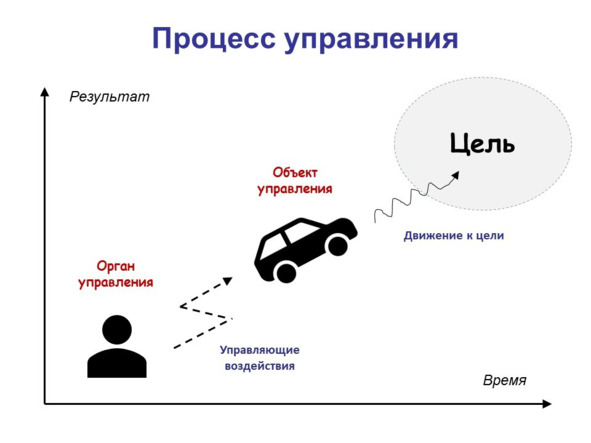 Но вернемся снова к более общему понятию «управление». Это процесс. В чем он состоит? У нас есть цели управления. Например, если мы управляем автомобилем, но делаем это не ради того, чтобы как-то убить время (хотя часто бывает и такое), а ради того, чтобы: 1) доехать из пункта А в пункт Б; 2) доехать к определенному времени; 3) доехать живыми и здоровыми; 4) доехать без материальных потерь (штрафов, повреждений); 5) получить удовольствие от поездки. Наверное, могут быть и другие цели. Ради них мы и садимся за руль. Как мы этих целей достигаем? Правильно. С помощью автомобиля. Но сам он не поедет. Им необходимо управлять. Это наш объект управления. Кто будет управлять? Водитель. Это орган управления. Беспилотные автомобили пока не рассматриваем. Но наши цели не достигаются мгновенно, даже, если у нас самый современный, роскошный и мощный автомобиль.