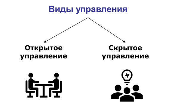Теперь рассмотрим классификацию управления по критерию осознанности. Здесь можно выделить тоже два вида: открытое и скрытое управление.