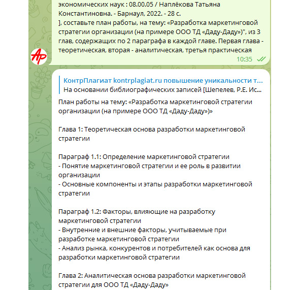 На основании библиографических записей [библиографический список литературы], составьте план работы, на тему: «Разработка маркетинговой стратегии организации (на примере ООО ТД Даду-Даду)», состоящий из 3 глав, содержащих по 2 параграфа в каждой главе. Первая глава теоретическая, вторая аналитическая, третья практическая. Предложите план изложения для каждого параграфа.