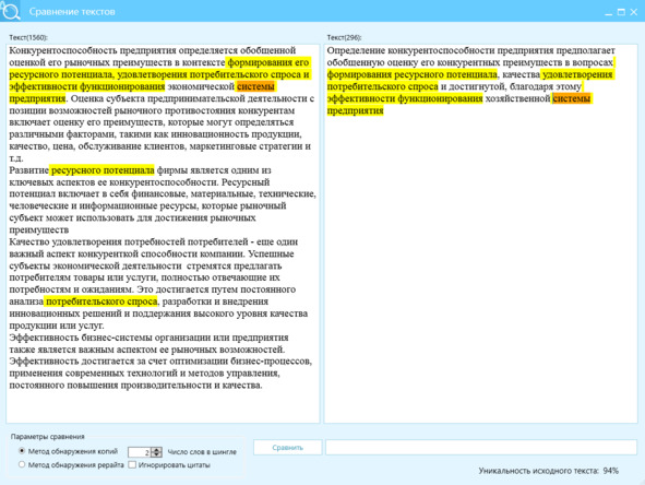 Во-вторых, КонтрПлагиат уникализирует текст. Алгоритм проверяет сгенерированный контент на соответствие индексам поисковых систем, таких как Google, Yandex, Rambler, Bing и Yahoo. Сверка с индексом может осуществлять как по методу шинглов, так и с учетом рерайта. Используя результаты анализа, нейросеть вносит необходимые изменения, чтобы гарантировать высокую уникальность.