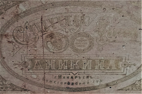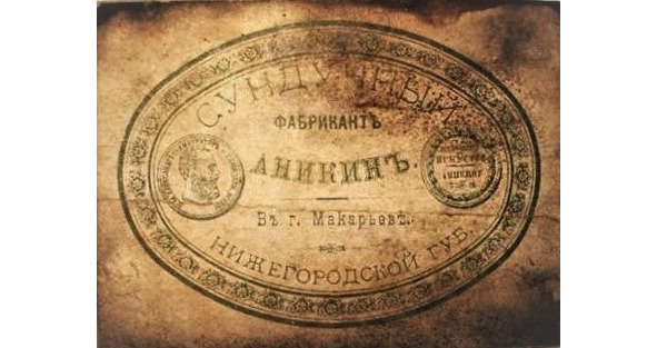 Второй вариант оформлен несколько иначе. У него также овальная форма, однако большее внимание уделено декоративному оформлению: мотивы классического искусства (меандр, розетки, лист аканта, растительные завитки) не только заполняют рамки, но и декорируют буквы. Надписи следующие: «Сундучная фабрика», затем изображения медалей, ниже «Аникина» и «г. Макарьев Нижегородской губ.».