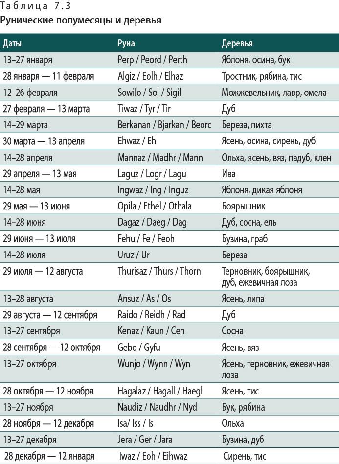 Хотя не каждая руна напрямую связана с деревом, на пути к языческим практикам были сопоставлены и вошли в общий обиход различные их качества и особенности. Впервые про рунические полумесяцы я прочла в «Языческой книге дней» Найджела Пенника (род. в 1946 г.), крупного специалиста в области древних систем верований. Рунические полумесяцы связаны с энергией и мудростью соответствующих символов. Таблица 7. 3 включает в себя различные написания и комбинации рунических названий в старшем футарке и младшем футарке, а также англосаксонском списке рун.