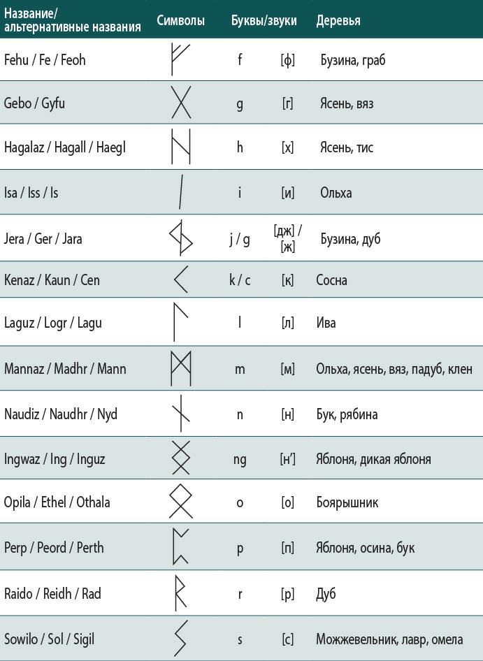 Чтобы помочь вам в работе с рунами, таблица 7. 4 содержит список рунических символов, упорядоченных по буквам/звукам, которые они представляют. В таблице также представлены англосаксонские руны и руны из младшего футарка, используемые в характеристиках деревьев из второй части книги, но не включенные в рунические полумесяцы.