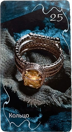 Кольцо карта больше нейтральная, она подвержена влиянию окружающих карт. Когда возникают вопросы в раскладах стабильности и официальности, брака ответ «да». Когда вопросы связаны с изменением ситуации и движением, то ответ «нет», так как карта символизирует еще цикличность. Покажет заморозку ситуации и ведение по кругу в негативном окружении карт.