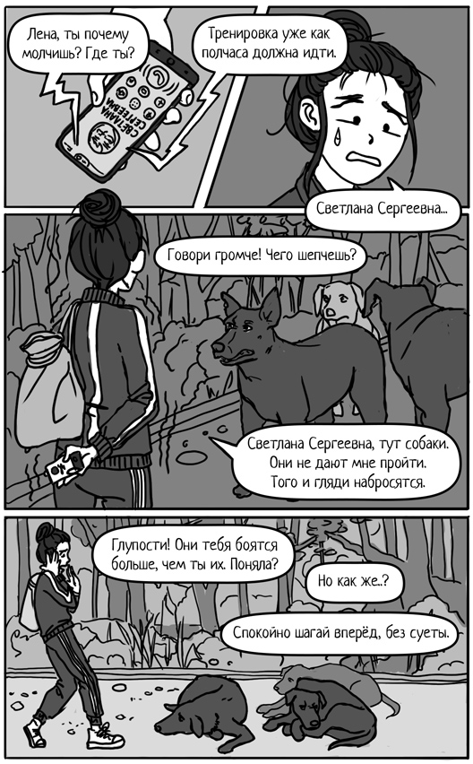 Откуда только взялась эта свора бездомных? На кленовом бульваре, по которому Лена три раза в неделю ходила на тренировку, собаки всегда гуляли под присмотром хозяев, на поводках и в намордниках, если большие. А эти без ошейников и обозлённые то ли от голода, то ли от бродячей жизни в целом.