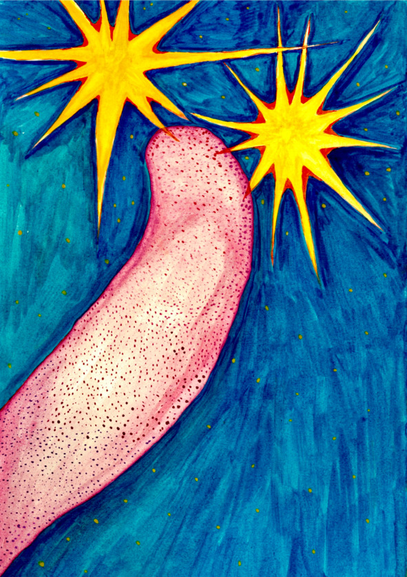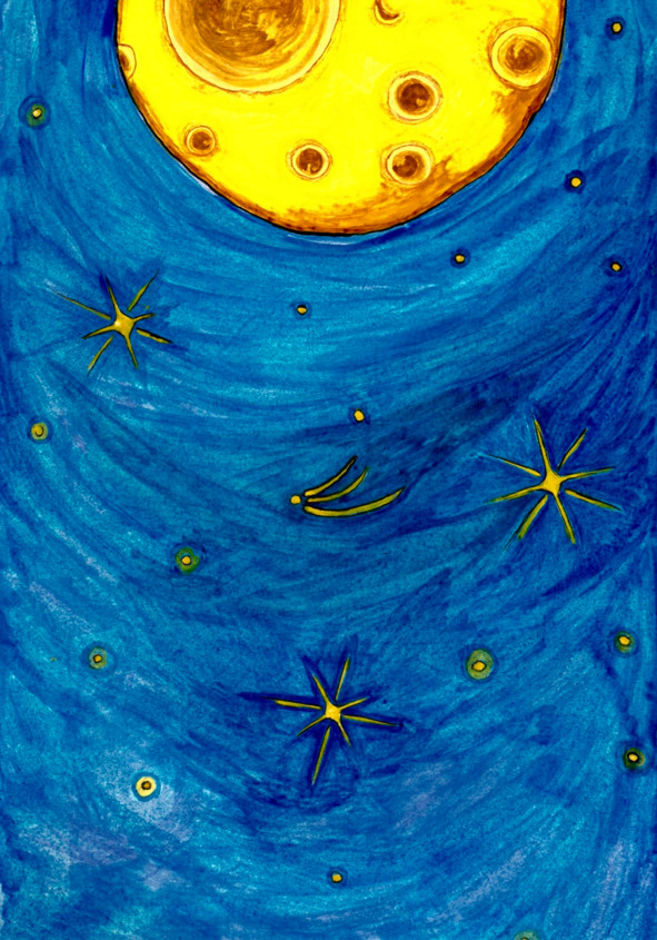 Сразу за полдником начинался вечер. Корова Лу любила вечера по-особенному. Она залезала на холм, и пока долина до краев наполнялась туманом, Лу ждала падающих звёзд. Каждый раз, когда очередная звёздочка срывалась с неба, корова вытягивала свой длинный язык и ловила её. Они были почти, как её любимые жёлтые цветы, только чуть кололись. Там же на холме Лу засыпала и светилась до утра как фонарик то ли от радости, то ли от звёзд.