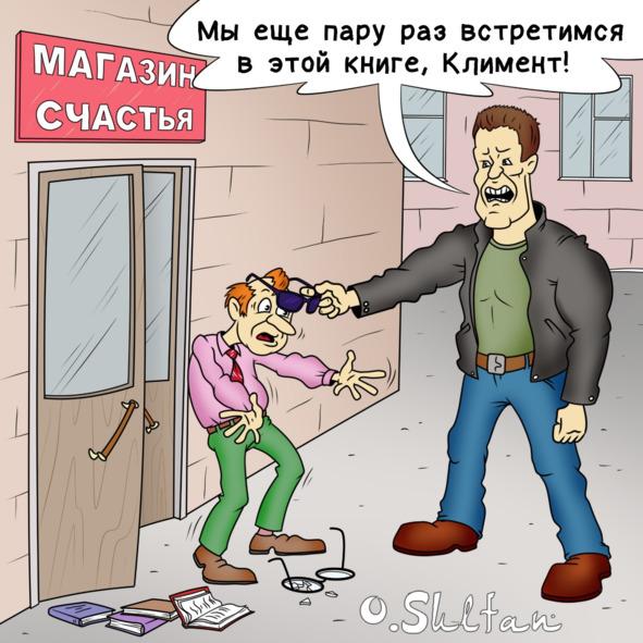 Выходит жизнерадостный такой, слегка взволнованный и очень довольный своими покупками, улыбка до ушей. Протирая запотевшие очки, смахивающие на лупу, столкнулся с каким-то мужчиной тоже в очках и уронил все книги, сломал лупы. Мужчина поднял книги с земли и, смотря прямо ему в глаза, сказал: