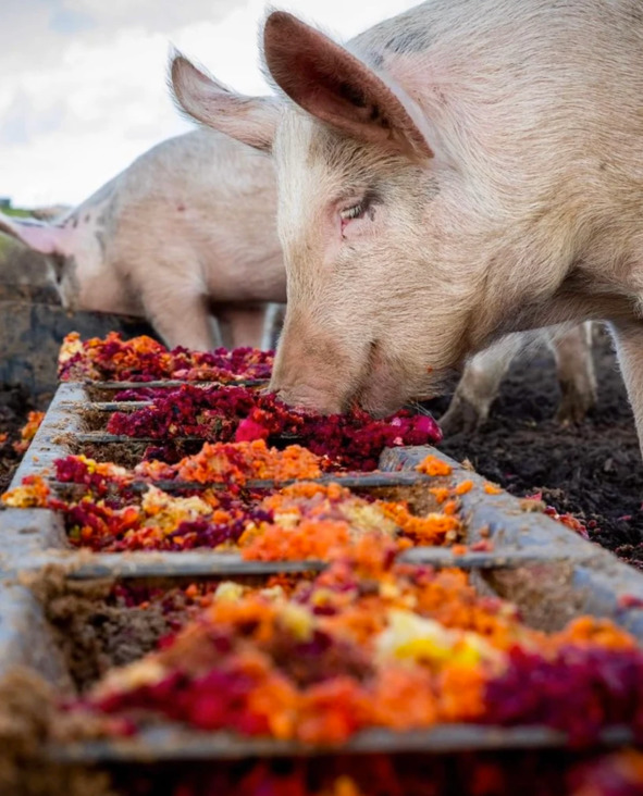 Historien bliver en tand bedre når de kan fortælle at overskydende frugt- og grøntsagskød (Pulp) fra produktionen leveres tilbage til landbruget. Det leveres til det økologiske landbrug Hegnsholt i Lejre. Her bliver pulpen brugt som foder til grisene og hønsene.