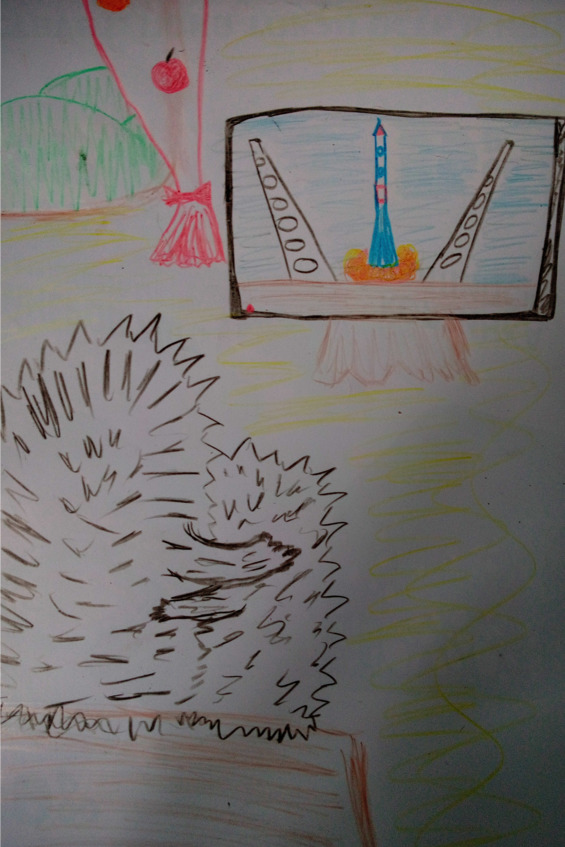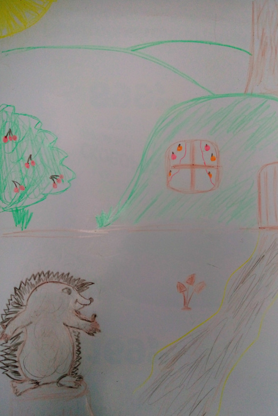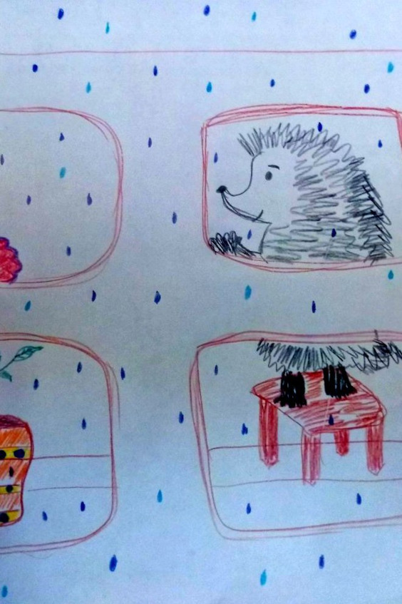 А сейчас дождь за окном не переставая всё лил и лил. «Как будто очень одинокая тучка всё плачет и плачет от того что ей не с кем поиграть», подумал Фышка глядя в окно. «Тук тук тук!», услышал вдруг Фышка. Этот стук совсем не был похож на дождь и маленький ёжик побежал к двери. Он бежал на цыпочках, чтобы не разбудить брата, но уже представлял себе кто же может быть за дверью.