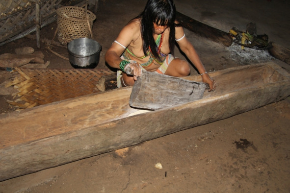 Ишко размалывает зерна кукурузы с помощью массивного деревянного пестика