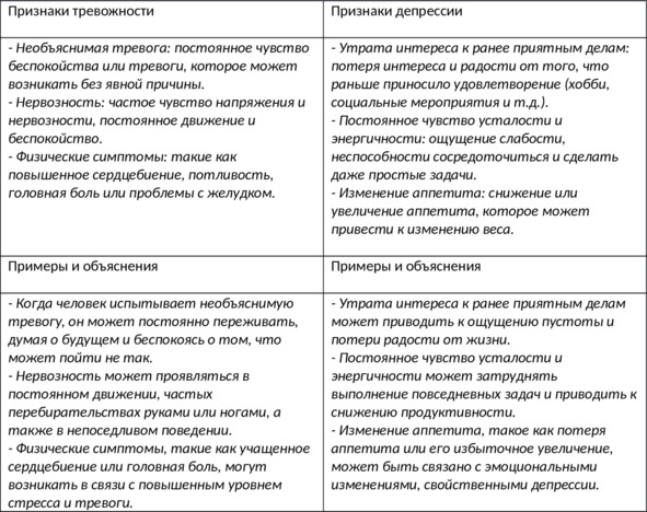 В каждом разделе перечислите признаки, которые соответствуют тревожности или депрессии. Например, для тревожности это может быть «необъяснимая тревога» и «нервозность», а для депрессии «утрата интереса к ранее приятным делам» и «постоянное чувство усталости».