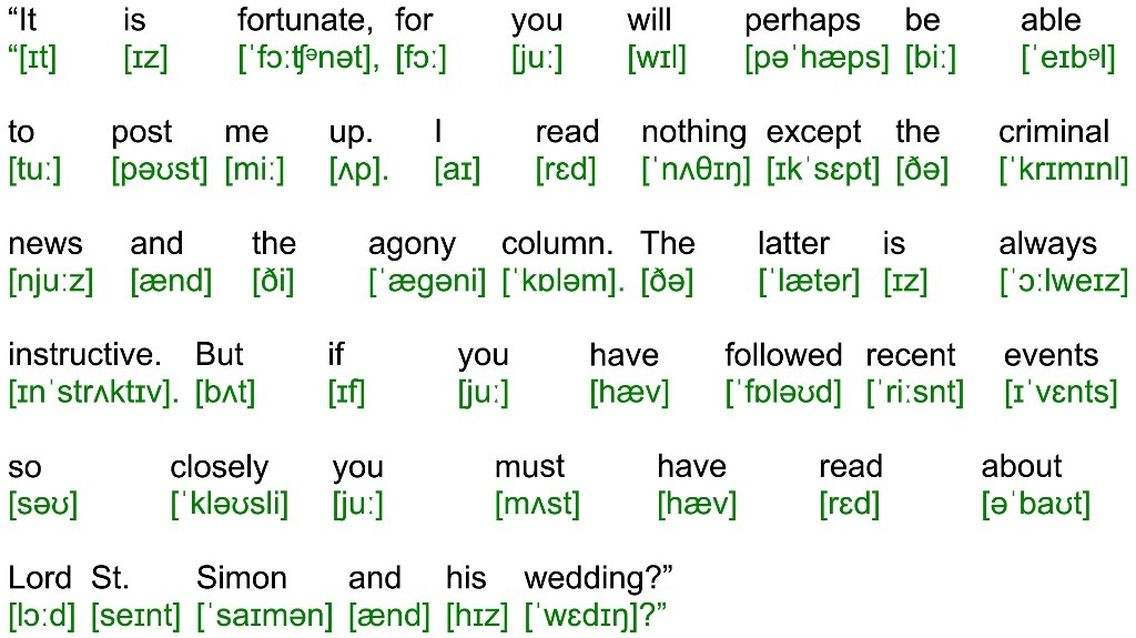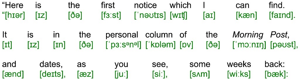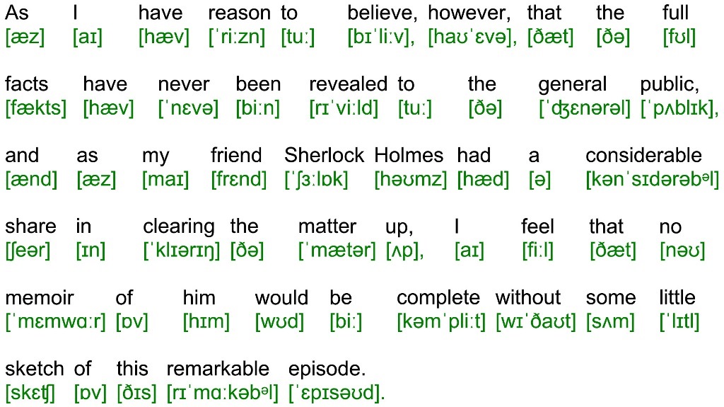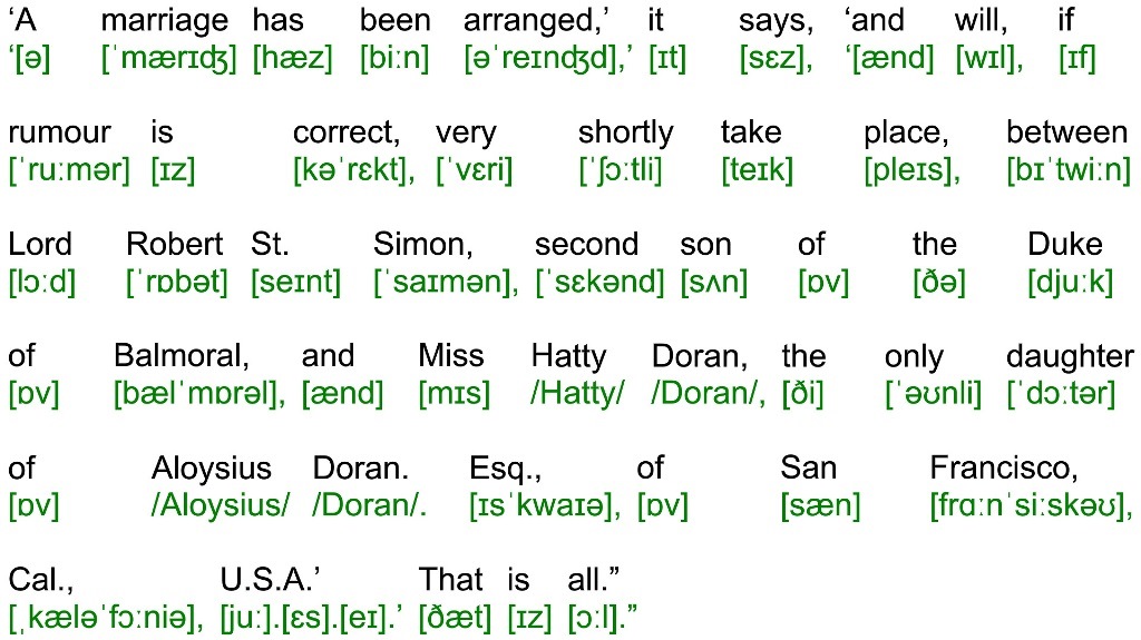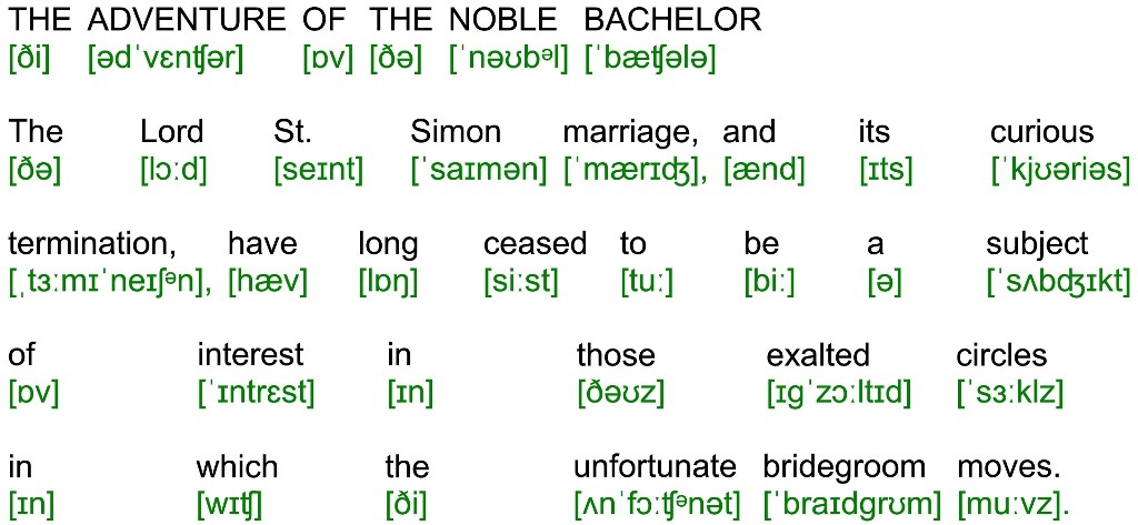 В данной книге приводится транскрипция текста рассказа А.К. Дойла «Знатный холостяк» на английском языке. Текст рассказа разбит на небольшие фрагменты. Фрагменты пронумерованы порядковыми номерами (01, 02,,63). После номера фрагмента приведены время начала и окончания аудиозаписи текста фрагмента в аудиокниге. Для каждого фрагмента подготовлена транскрипция текста, оформленная в виде иллюстраций с изображением транскрипции текста фрагмента.
